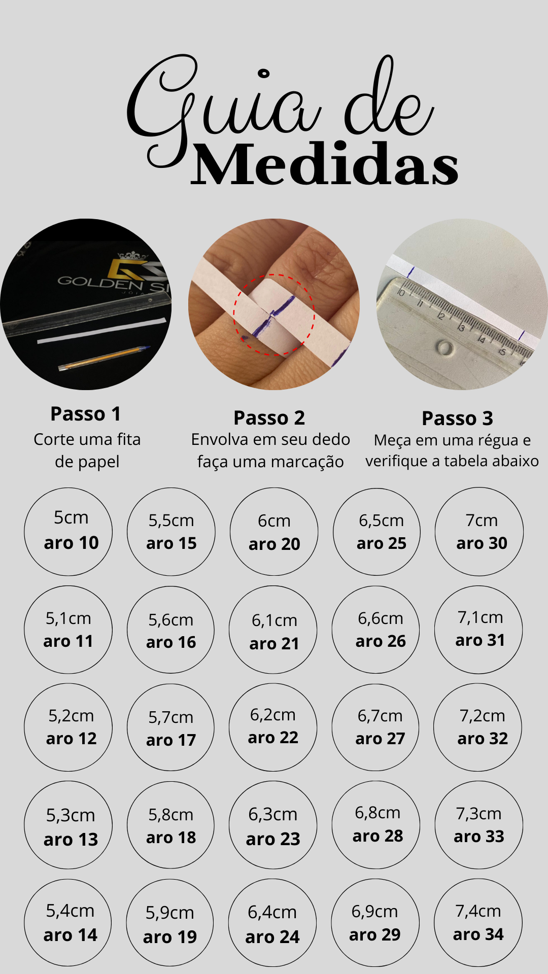 Antes de finalizar seu pedido, recomendamos conferir com atenção o número correto, utilizando um medidor de anel ou consultando nosso guia de medidas.